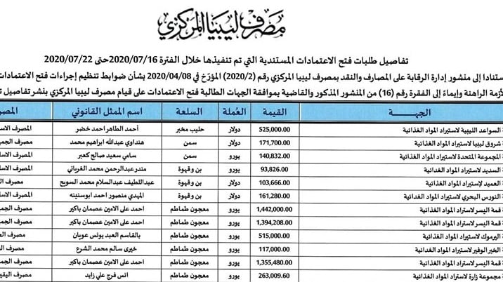 استناداً إلى منشور إدارة الرقابة على المصارف والنقد بمصرف ليبيا المركزي رقم (2/2020) المؤرّخ في 2020/04/08 بشأن ضوابط تنظيم إجراءات فتح الاعتمادات المستندية خلال الأزمة الراهنة، وإيماءً إلى الفقرة رقم (16) من المنشور المذكور والقاضية بموافقة الجهات الطالبة فتح الاعتمادات على قيام مصرف ليبيا المركزي بنشر تفاصيل تلك الاعتمادات.
