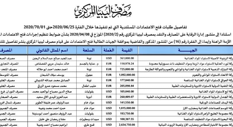 استناداً إلى منشور إدارة الرقابة على المصارف والنقد بمصرف ليبيا المركزي رقم (2/2020) المؤرّخ في 2020/04/08 بشأن ضوابط تنظيم إجراءات فتح الاعتمادات المستندية خلال الأزمة الراهنة وإيماءً إلى الفقرة رقم (16) من المنشور المذكور والقاضية بموافقة الجهات الطالبة فتح الاعتمادات على قيام مصرف ليبيا المركزي بنشر تفاصيل تلك الاعتمادات.