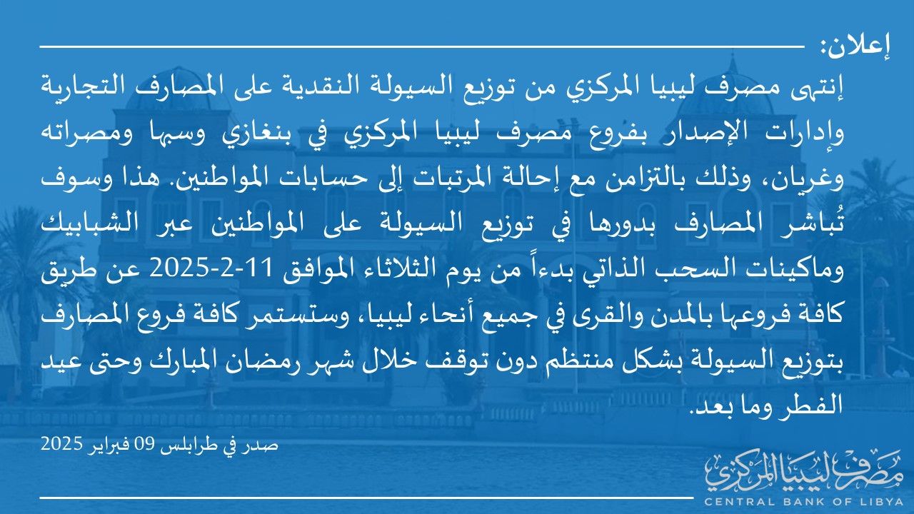 تفاصيل طلبات فتح الاعتمادات المستندية التي تم تنفيذها خلال الفترة من 2025/01/30 حتى 2025/02/12، وذلك إستناداً إلى منشور إدارة الرقابة على المصارف والنقد بمصرف ليبيا المركزي رقم (2025/1) المؤرخ في 2025/01/02، وإلى المنشور إ ر م ن رقم (2024/16) المؤرّخ في 2024/10/14 بشأن الضوابط المنظمة للتعامل بالنقد الأجنبي، وإيماءً إلى الفقرة سادِساً، النقطة رقم (6) من الضوابط العامة بالمنشور المذكور والقاضية بموافقة الجهات الطالبة فتح الاعتمادات على قيام مصرف ليبيا المركزي بنشر تفاصيل تلك الاعتمادات.