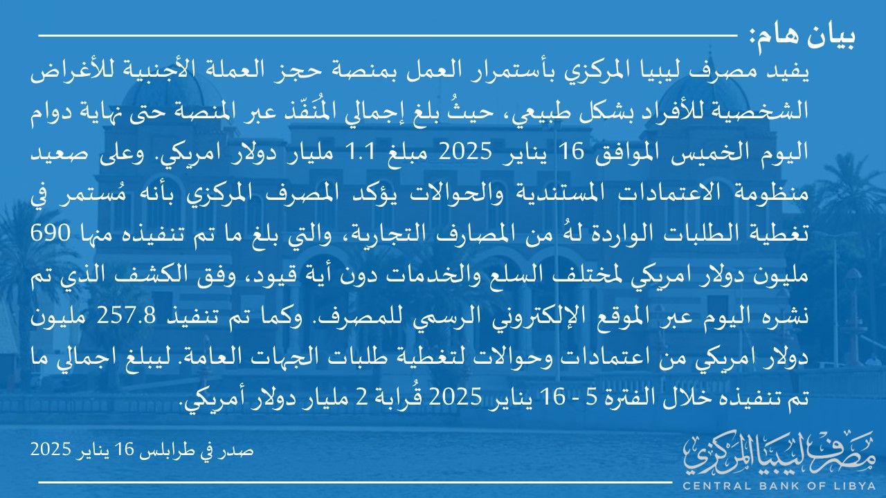 تفاصيل طلبات فتح الاعتمادات المستندية التي تم تنفيذها خلال الفترة من 2025/01/19 حتى 2025/01/29، وذلك إستناداً إلى منشور إدارة الرقابة على المصارف والنقد بمصرف ليبيا المركزي رقم (2025/1) المؤرخ في 2025/01/02، وإلى المنشور إ ر م ن رقم (2024/16) المؤرّخ في 2024/10/14 بشأن الضوابط المنظمة للتعامل بالنقد الأجنبي، وإيماءً إلى الفقرة سادِساً، النقطة رقم (6) من الضوابط العامة بالمنشور المذكور والقاضية بموافقة الجهات الطالبة فتح الاعتمادات على قيام مصرف ليبيا المركزي بنشر تفاصيل تلك الاعتمادات.