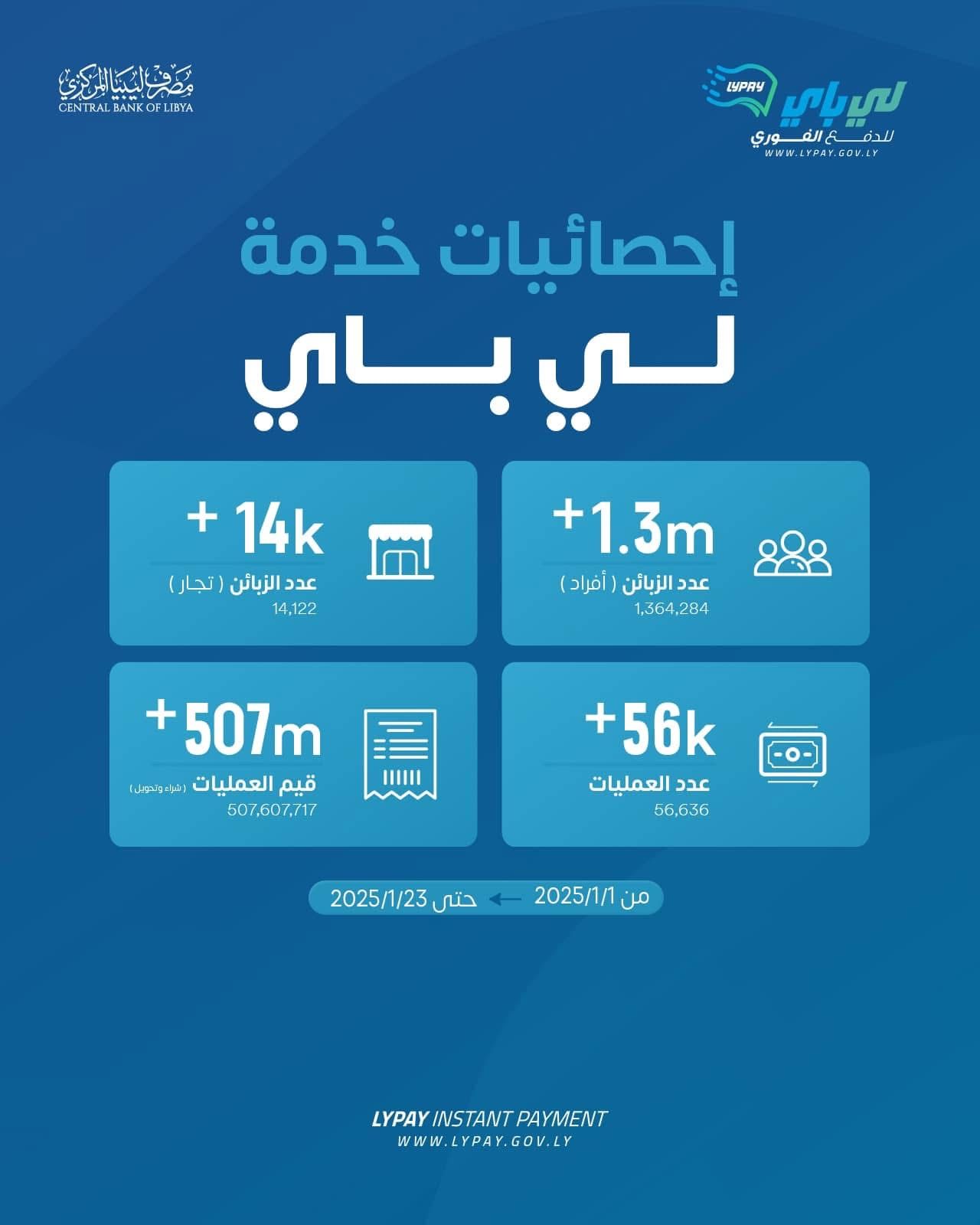 امتثالاً لاستراتيجية مصرف ليبيا المركزي نحو تعزيز الشمول المالي، وتماشياً مع خطة تطوير خدمات الدفع الإلكتروني. وتنفيذاً لمبادئ الافصاح والشفافية. يُعلن المصرف المركزي عن إحصائية خدمات الدفع الفوري: “لي باي” (LYPay) و “وان باي” (OnePay)، للفترة الممتدة من 1/1-2025 حتى تاريخ اليوم 1/23-2025. ويؤكد مصرف ليبيا المركزي أنه سيستمر في رفع أسقف التحويل والشراء تدريجياً عبر خدمات الدفع الفوري.
