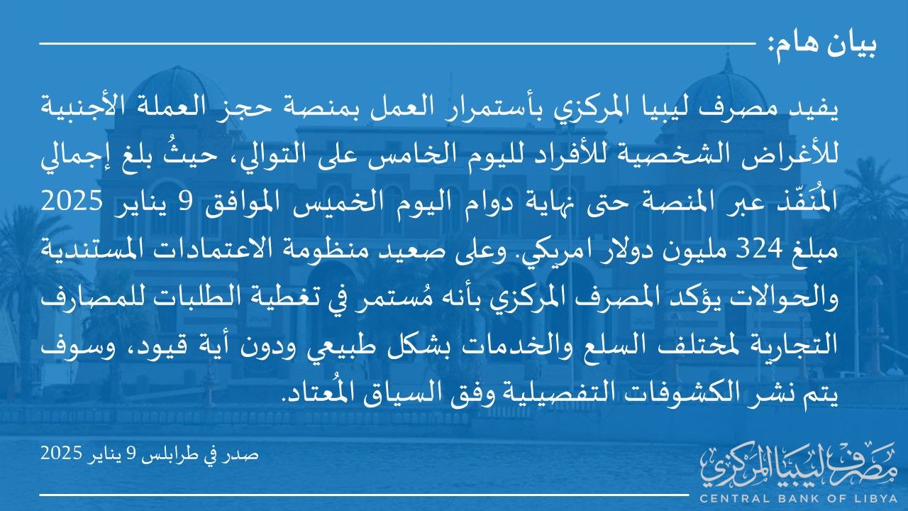 يَسُرُّ مصرف ليبيا المركزي أن يضع بين أيديكم بيانَهُ الشهري للإيراد والإنفاق العام، والّذي يُغَطّي الفترة المُمَتَدّة من 2024/01/01 حتى 2024/11/30.
