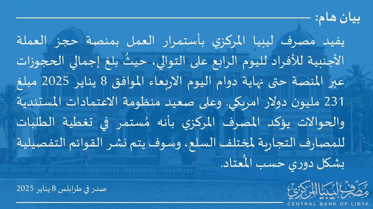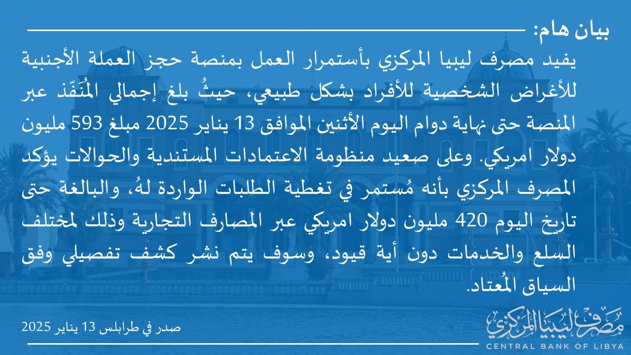 يَسُرُّ مصرف ليبيا المركزي أن يضع بين أيديكم بيانَهُ الشهري للإيراد والإنفاق العام، والّذي يُغَطّي الفترة المُمَتَدّة من 2024/01/01 حتى 2024/12/31.