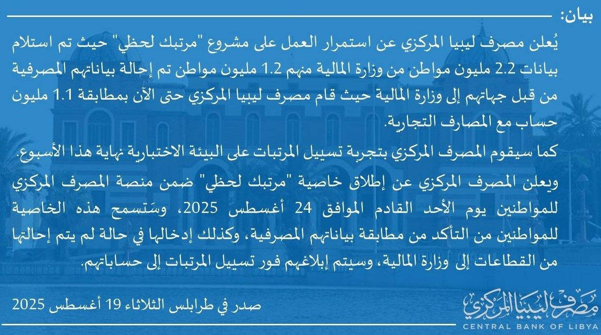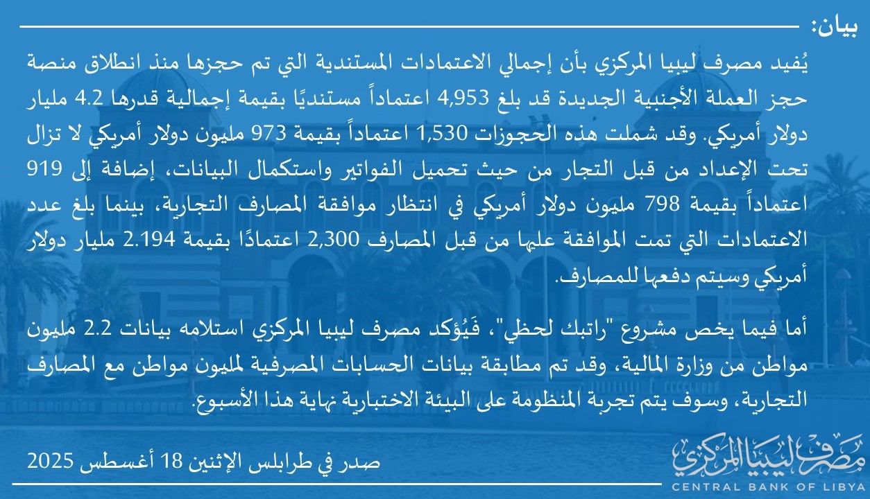 ويُطمئن المصرف المركزي السادة المواطنين فجميع حقوقهم محفوظة بالكامل، ولن يتضرر أي حامل لهذه الأوراق النقدية طالما تم إيداعها في المصارف ضمن المواعيد المحددة. كما أن المصارف التجارية سوف تبدأ في استلام هذه الفئات وايداعها لدى المصرف المركزي تدريجياً وتوفير البديل حتى تاريخ 2025/09/30، ويُنصح بالاعتماد فقط على البيانات والتوضيحات الرسمية الصادرة عن مصرف ليبيا المركزي باعتباره المصدر الوحيد المعتمد والموثوق للمعلومة.