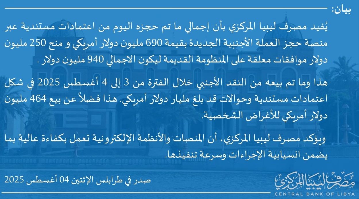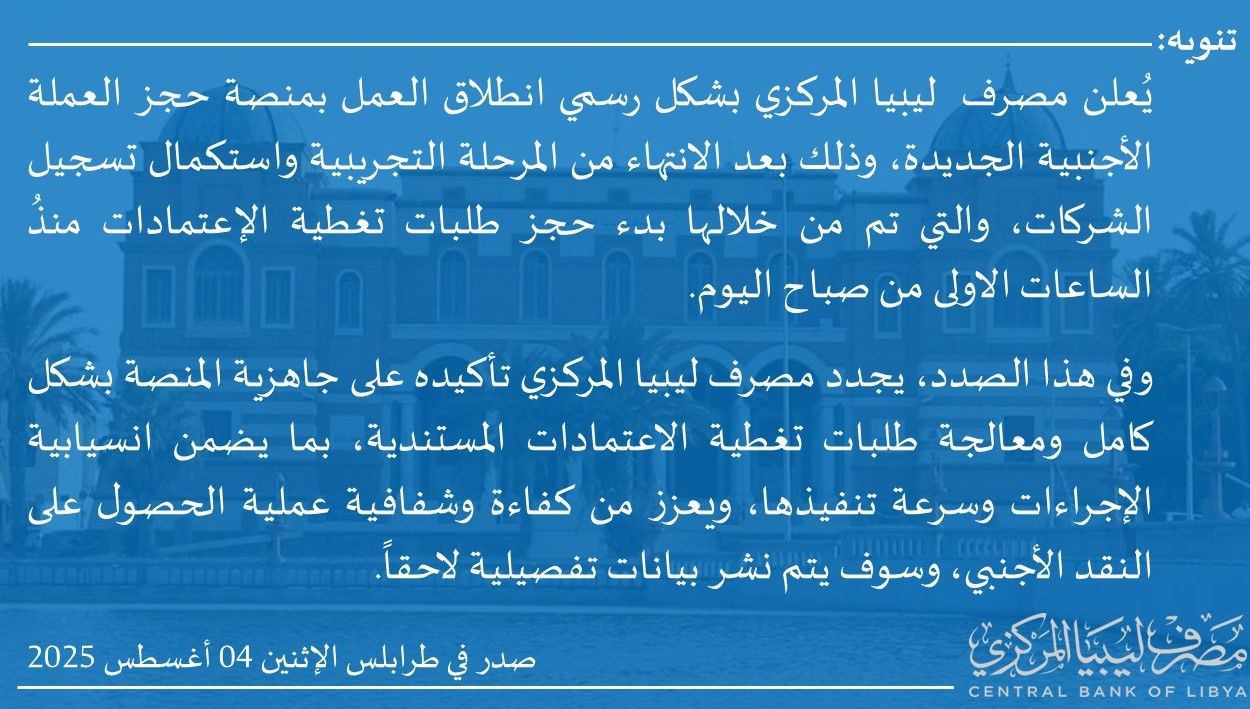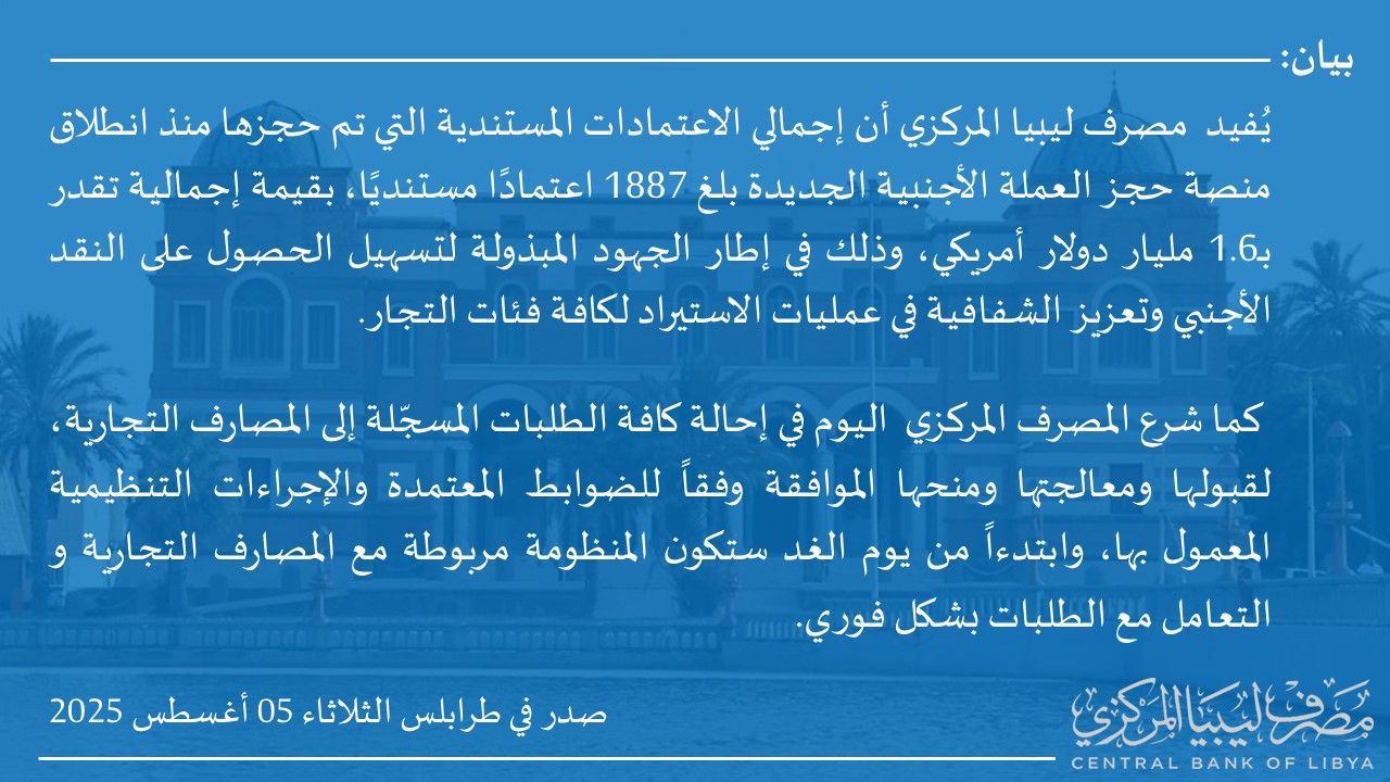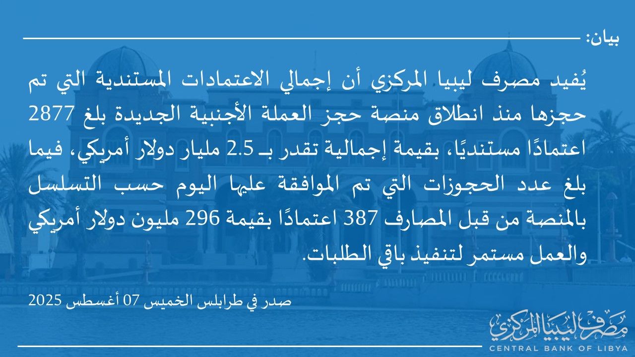 تفاصيل طلبات فتح الاعتمادات المستندية التي تم تنفيذها خلال الفترة من 2025/07/01 حتى 2025/07/31، وذلك إستناداً إلى منشور إدارة الرقابة على المصارف والنقد بمصرف ليبيا المركزي رقم (2025/10) المؤرخ في 2025/04/06، بشأن الضوابط المنظمة للتعامل بالنقد الأجنبي، وإيماءً إلى الفقرة السَّابعة، النقطة رقم (10) من الضوابط العامة بالمنشور المذكور والقاضية بموافقة الجهات الطالبة فتح الاعتمادات على قيام مصرف ليبيا المركزي بنشر تفاصيل تلك الاعتمادات.