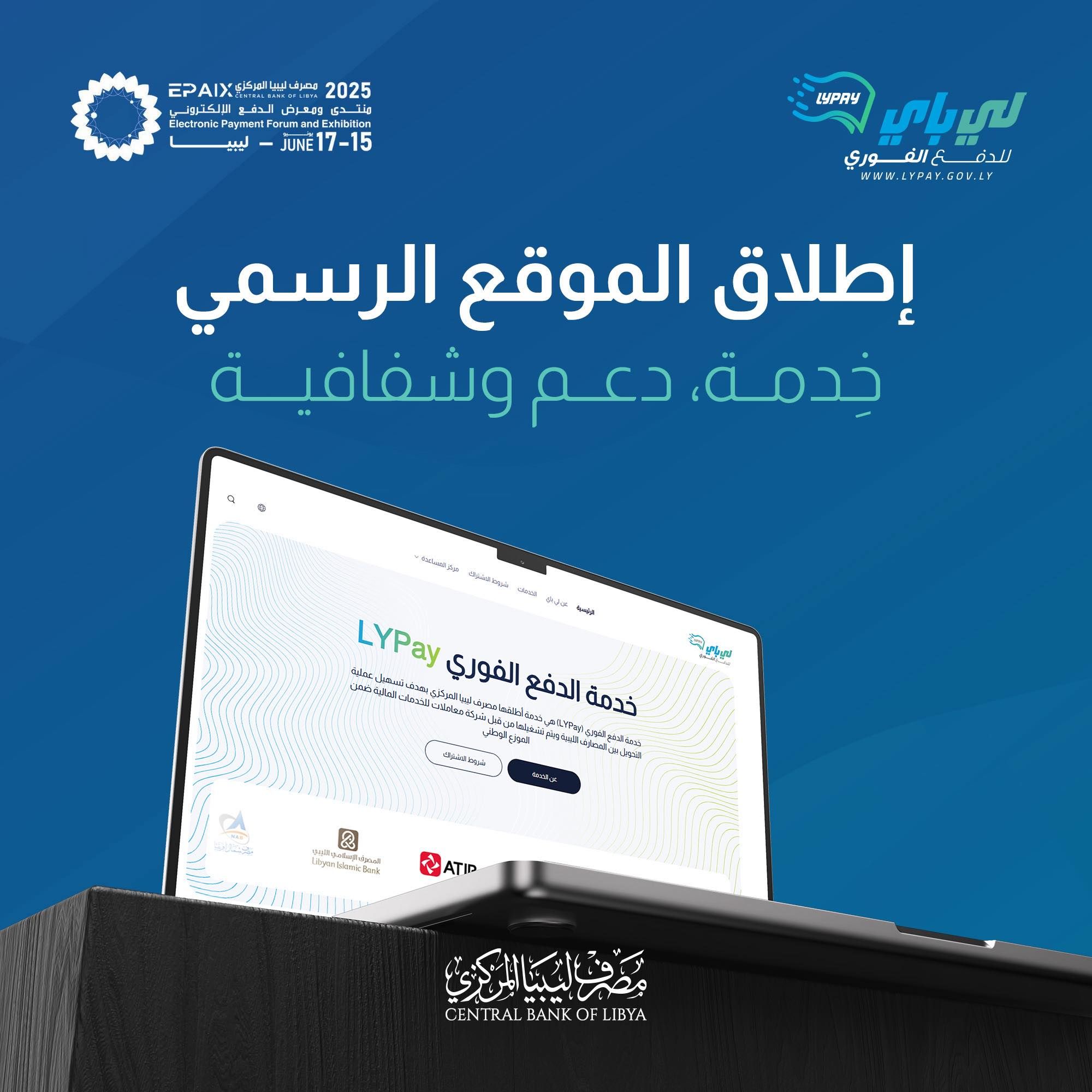 في إطار إطار إختتام فعاليات مُنتدى ومعرض الدفع الإلكتروني EPAIX 2025، وتطوير خدمات الدفع الأول في ليبيا، يُعلن مصرف ليبيا المركزي بكل فخر عن الإطلاق الرسمي للموقع الإلكتروني الخاص بخدمة الدفع الفوري (LYPay).