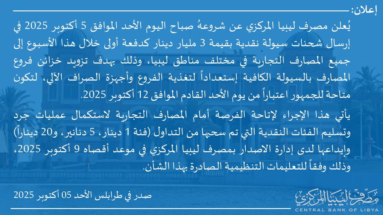عقد السيد ناجي محمد عيسى محافظ مصرف ليبيا المركزي اليوم الثلاثاء الموافق 7 اكتوبر 2025، وبحضور السيد نائب المحافظ وعدد من مدراء الادارات المختصة بالمصرف، اجتماعاً موسعاً لمناقشة آلية العمل التي شرع المصرف في اعدادها لمزاولة نشاط الصرافة، استعداداً لعمل الشركات والمكاتب التي تحصلت على الموافقة النهائية.