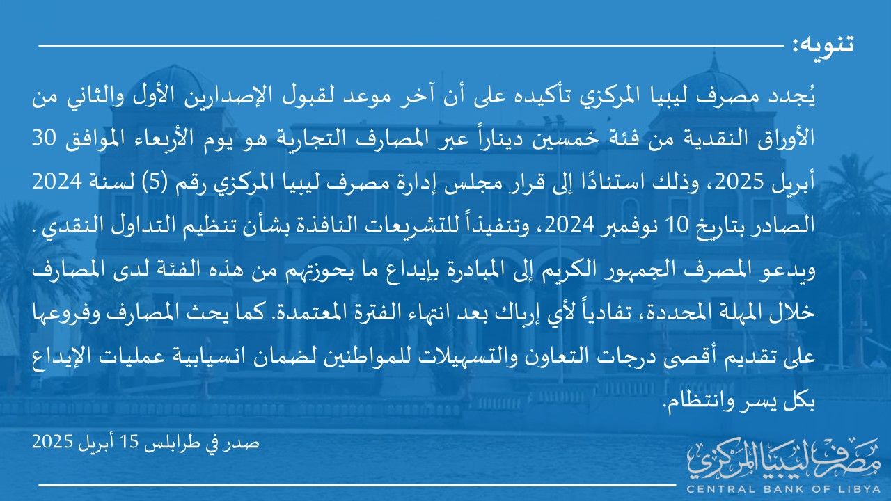 ترأس محافظ مصرف ليبيا المركزي السيد ناجي محمد عيسى، ونائبه مرعي مفتاح البرعصي، صباح اليوم الاثنين الموافق 14 أبريل 2025، جلسة مشاورات المادة الرابعة التي تجري هذه الأيام بين مصرف ليبيا المركزي وصندوق النقد الدولي، وبمشاركة فرق فنية متخصصة تمثل عدداً من الجهات السيادية، من بينها وزارات المالية، والاقتصاد والتجارة، والتخطيط، والعمل والتأهيل، والعدل، والتعليم، والصحة، بالإضافة إلى ديوان المحاسبة والمؤسسة الوطنية للنفط، وهيئة الرقابة الإدارية، ومصلحة الاحصاء والتعداد.