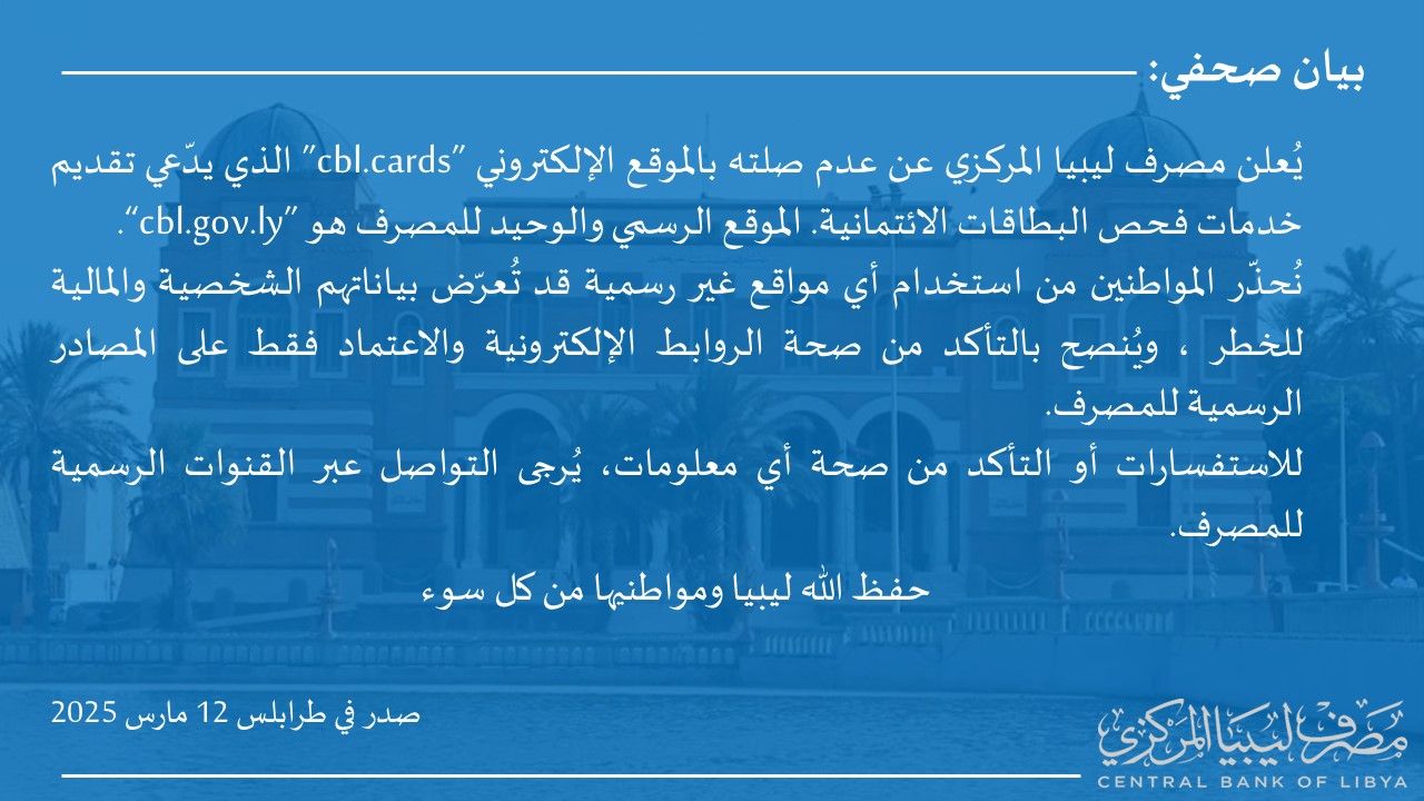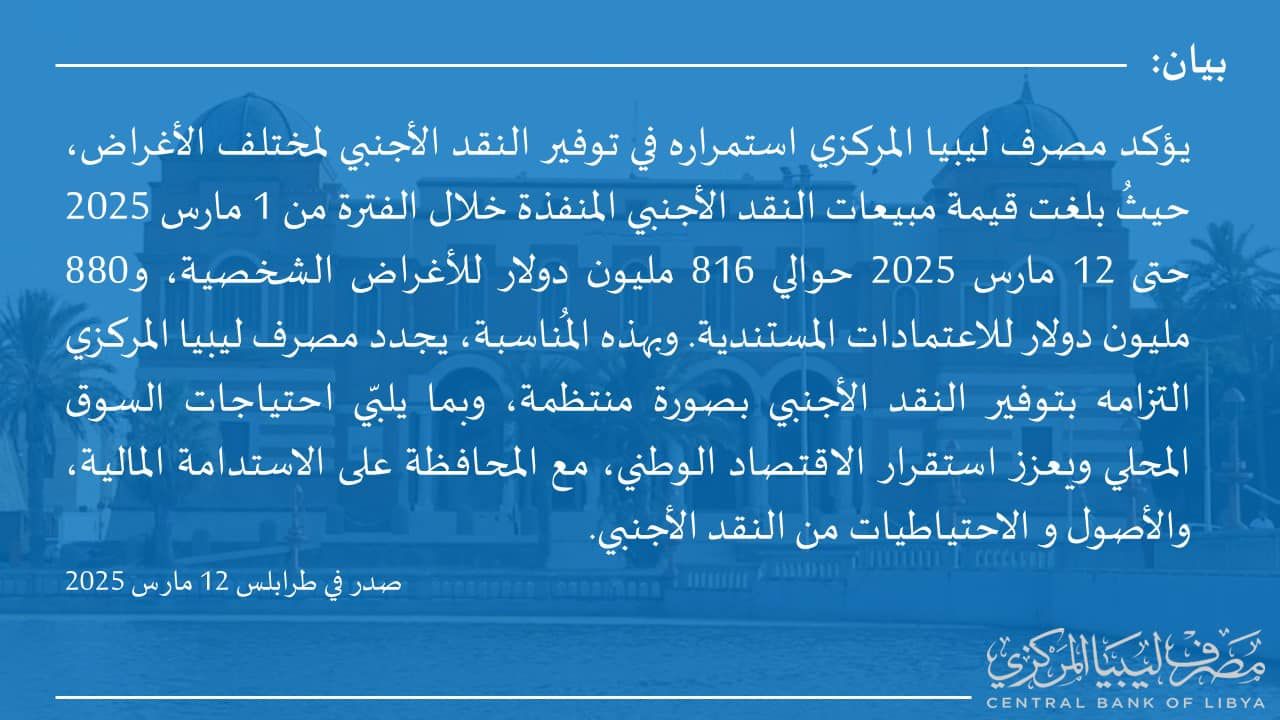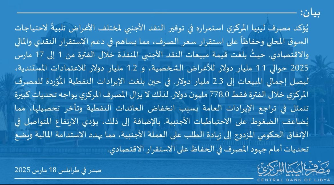 يَسُرُّ مصرف ليبيا المركزي أن يضع بين أيديكم بيانَهُ الشهري للإيراد والإنفاق العام، والّذي يُغَطّي الفترة المُمَتَدّة من 2025/01/01 حتى 2025/02/28.