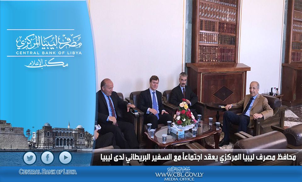 اجتمع محافظ مصــرف لیبیا المركزي الســید ” الصــدیق عمر الكبیر ” بمكتبه بطرابلس صباح يوم الاثنين الموافق 8-8-2016 ، مع السـيـد “بيتـر ميليت” ، السفير البريطاني لدى ليبيا ، وتناول الاجتماع مناقشة القضایا الاقتصادیة والمالیة ذات الاھتمام المشترك.