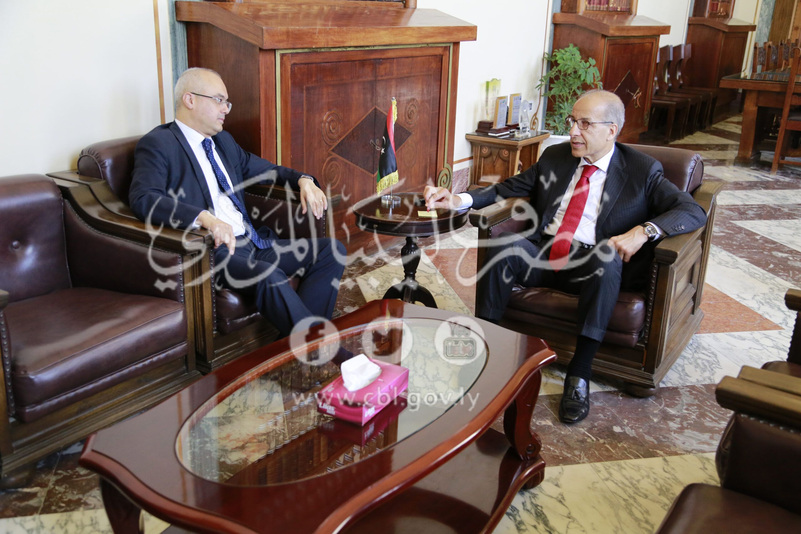 Mr.Saddek Omar Elkaber, Governor of the Central Bank of Libya meets with Mr.Ahmed Doghan the Turkish Ambassador to Libya at his office on Tuesday 12th of June 2018 , as they discussed during the meeting the mechanism of cooperation between the corporations of the state in both countries and the latest updates concerning the reactivation of the Turkish companies in Libya.