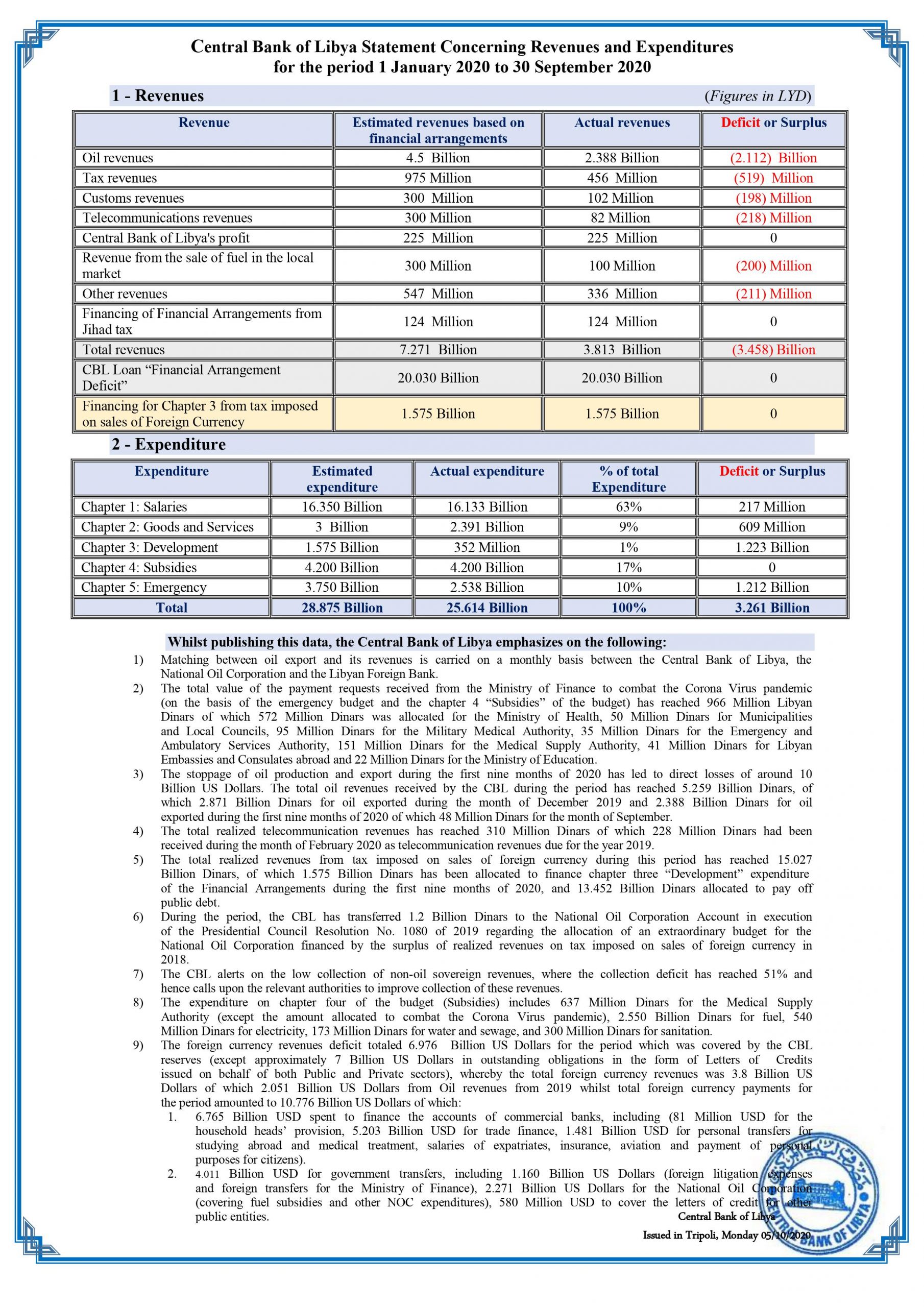 Central Bank of Libya Statement concerning Revenues and Expenditures for the period 1 January to 30 September 2020, along with the foreign currency sales for commercial banks (in USD) for the same period.