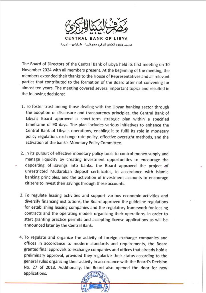 The Board of Directors of the Central Bank of Libya met on Sunday 11th of November 2024, at the headquarters of the Central Bank of Libya, the meeting was chaired by H.E Naji Mohammed Issa, the Governor, his deputy, Mr. Maree Al-Barasi, and in the presence of all board members. The meeting concluded with the following statement.