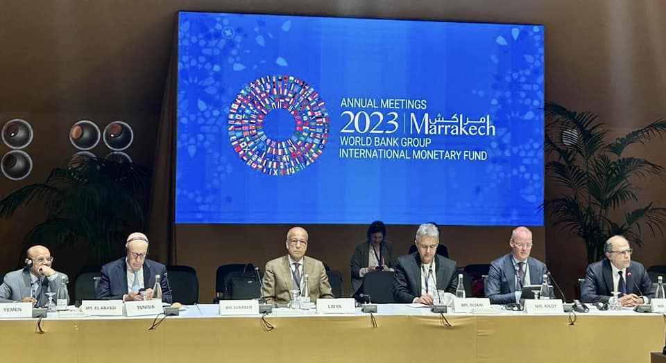 In his meeting held Wednesday morning 11th of October 2023, in Marrakesh, Kingdom of Morocco, with the governors of the Middle East and Central Asia region, in presence of the President of the International Monetary Fund (Kristalina Georgieva) and the Director of the Fund’s Middle East and Central Asia Department (Mr. Jihad Azour), H.E. Mr. Saddek Omar Elkaber Governor of the Bank of Libya. The Central Bank and its team discussed the economic and financial challenges and policies in the region in light of global inflation, and also discussed credit and liquidity risks in a stressful environment on the banking sector, and the strategies required to strengthen precautionary measures