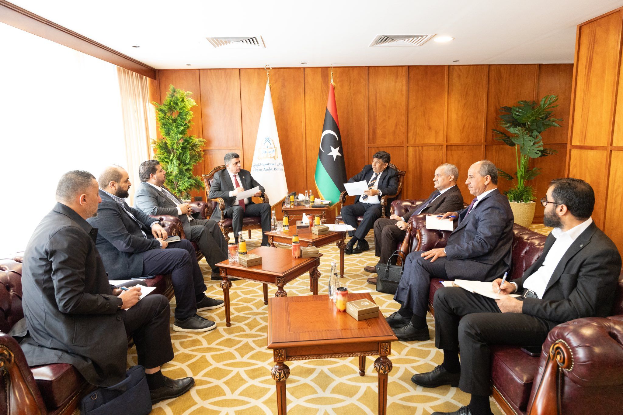 The Governor of the Central Bank of Libya, H.E. Naji Mohammed Issa, convened on Tuesday morning, 25 November 2025, at the Audit Bureau’s headquarters, for an extensive that brought together the President of the Audit Bureau, Mr. Khaled Shakshak; the Attorney General, Counselor Al-Siddiq Al-Sour; and the Chairman of the National Oil Corporation, Mr. Masoud Suleiman, with the participation of several specialized departments from the concerned institutions.