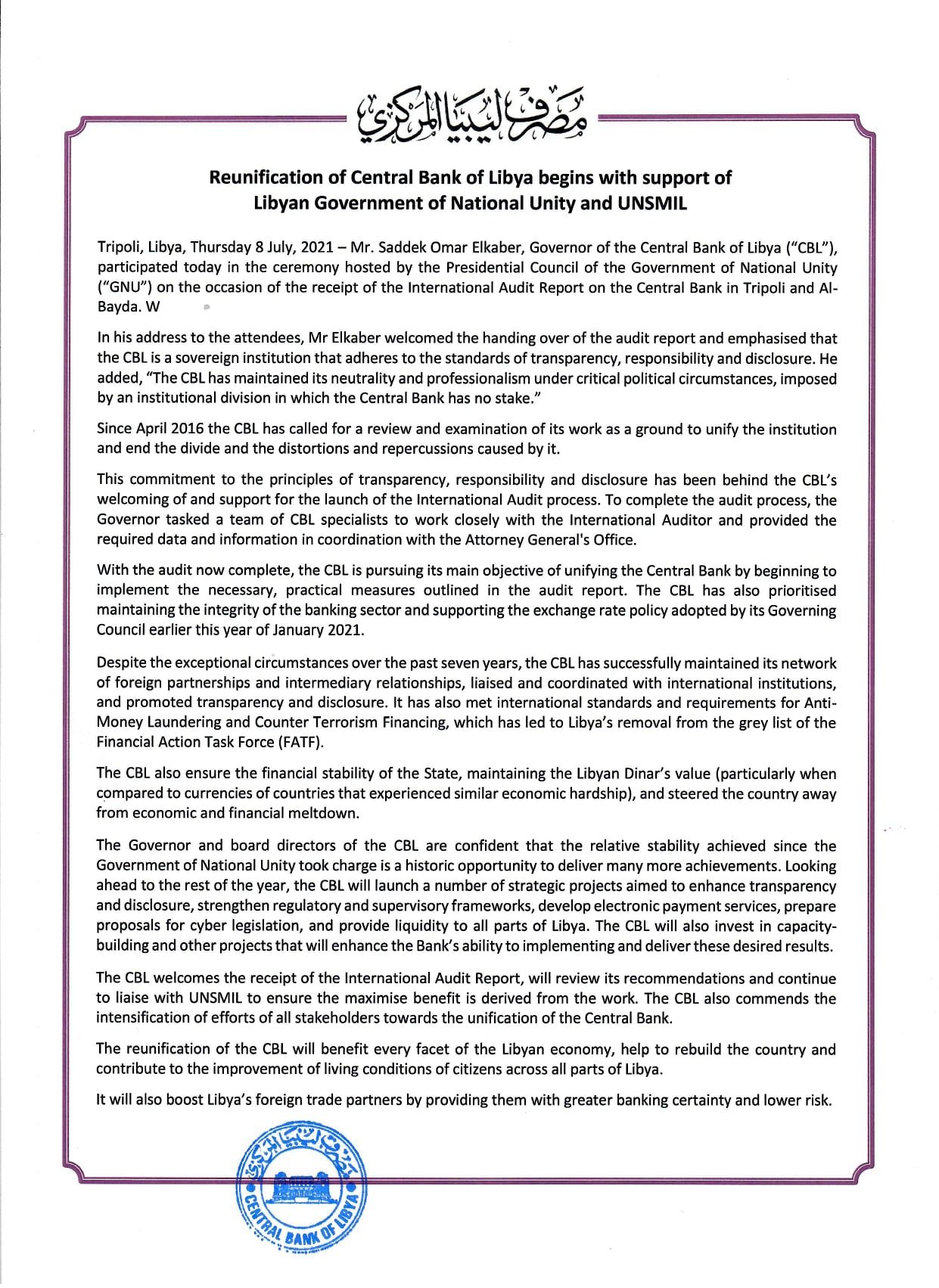 Reunification of central bank of Libya begins with support of Libyan Government of National Unity and UNSMIL