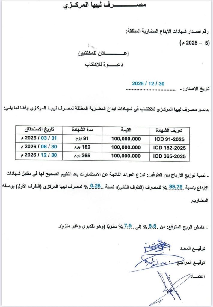 The Central Bank of Libya announces its invitation to commercial banks to subscribe to Issue No. (5–2025) of Absolute Mudaraba Deposit Certificates, in accordance with the procedures and controls applied in previous issues, and in line with the maturities and due dates specified in the subscription announcement.