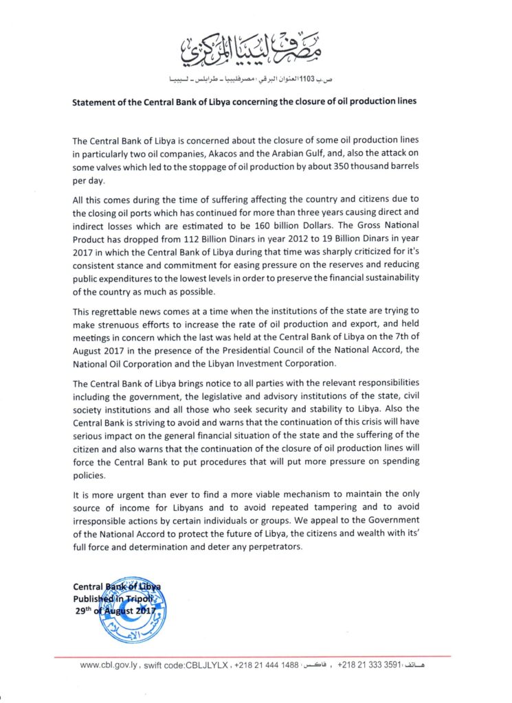 Statement of the Central Bank of Libya concerning the closure of Oil production lines