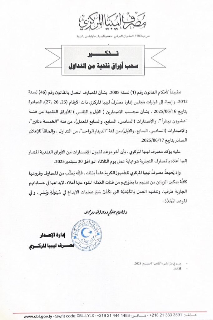 The Central Bank of Libya reminds the public of the final deadline for the withdrawal of certain banknotes from circulation