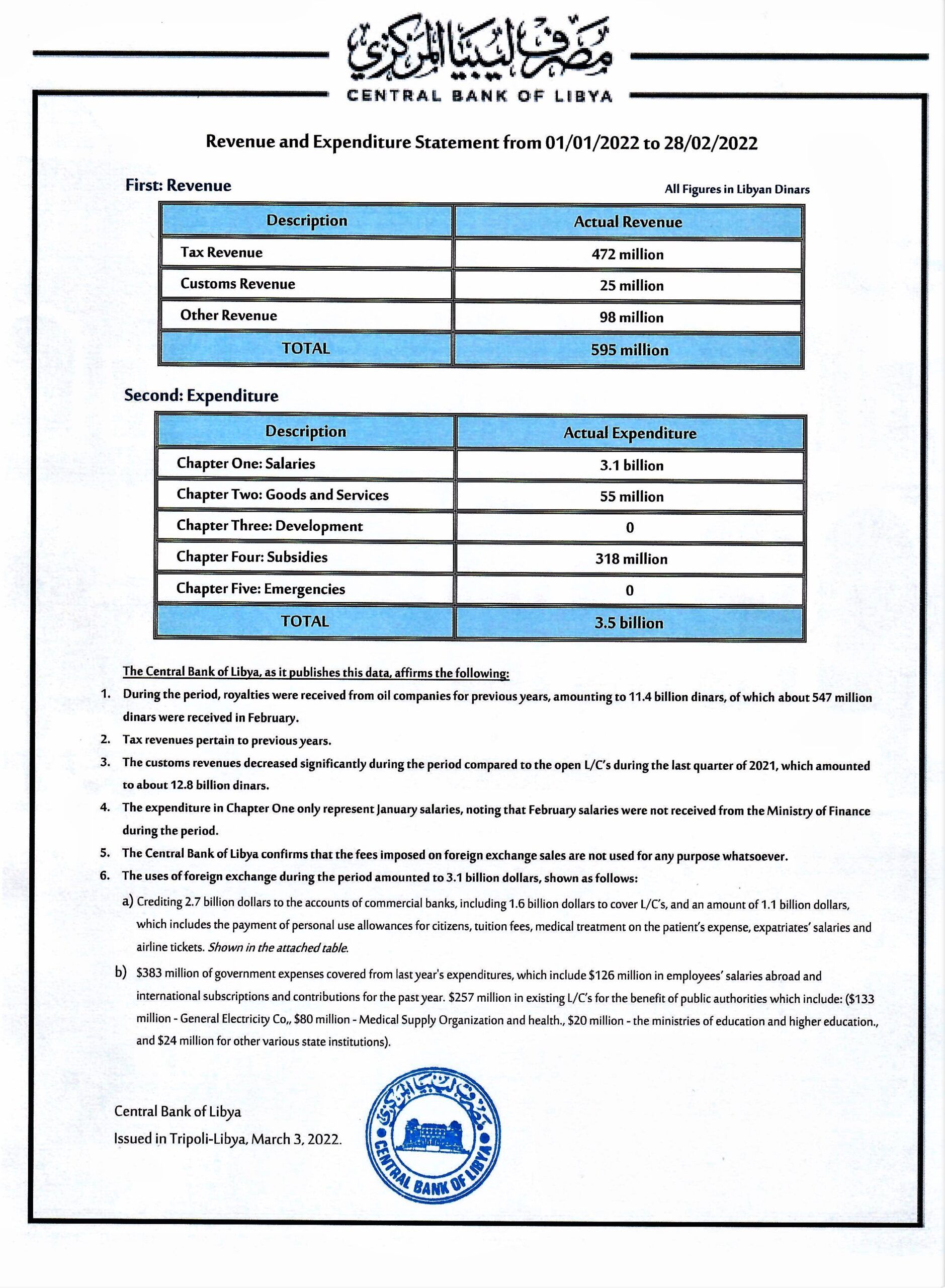 The Central Bank of Libya Revenue and Expenditure statement from 01/01/2022 to 28/02/2022 ,,
